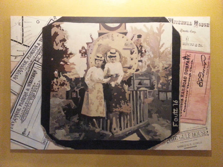 Thomasville Center for the Arts asked me and 5 other artists to create a small mural for their theme: “Planes, Trains and Automobiles”. Of course, I was chosen to paint one of the “train” pieces. We chose an image from the Thomasville Historical Society, and a 6′ x 4′ sheet of plywood and instructed to paint in any style we chose, just to reference the image we had chosen. Our ideas were approved, and we had one week to finish our mural. Keep in mind that these panels were set up at Grassroots Coffee on Broad Street. One artist a week painted their board in the little “cubby” in the store. I managed to work every evening, starting Monday, Feb. 1, and finally finished after working all day Saturday, Feb. 8th at 9:00 pm.