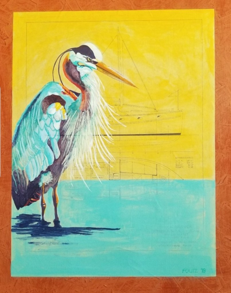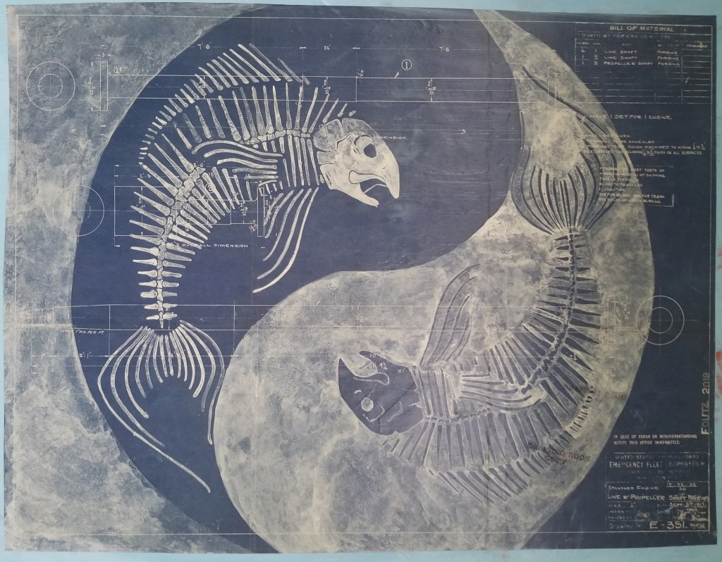 This is my latest collection – old papers repurposed. This is a tribute to the draftsmen that drew the originals. The objects they reproduced are obsolete now, as the drafting tables once employed are now replaced by laptops. The paints I apply over these papers are mostly translucent, allowing for the delicate lines and figures to peep through.
