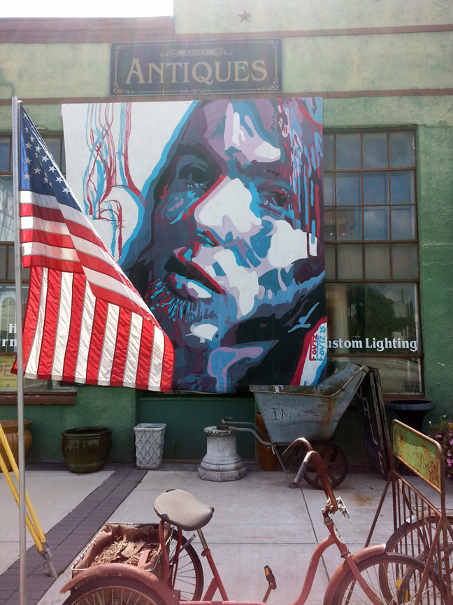 I have been a part of the City of Thomasville, Georgia’s Center for the Arts’ FLAUNT show for the past 6 years. The past two years, the challenge is to design and paint 12′ x 16′ murals on canvas, to be distributed around downtown. The most recent FLAUNT, still up until Sept 30, uses the theme “Rock On!” My assigned artist was Gregg Allman. I decided to use a 3D approach – and was successful! Hope you enjoy.